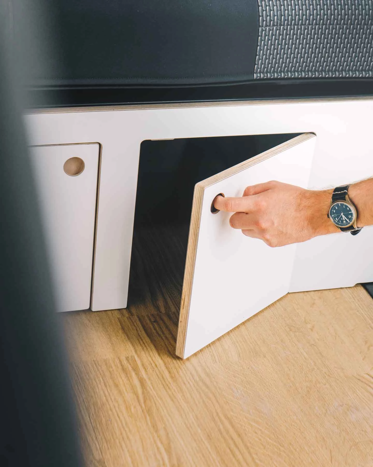 The first brain wave that I had was changing the handle choice. The ones we predominantly used were made of plastic and have been the typical campervan push buttons for many years. As a workshop, we would get through a lot of them! I thought about how could we redesign the units so that we could eliminate the plastic button options - and here came our Eco Upgrade Handles. And this is where Lucas our talented CNC creative came in! He could make these ideas into a real product.