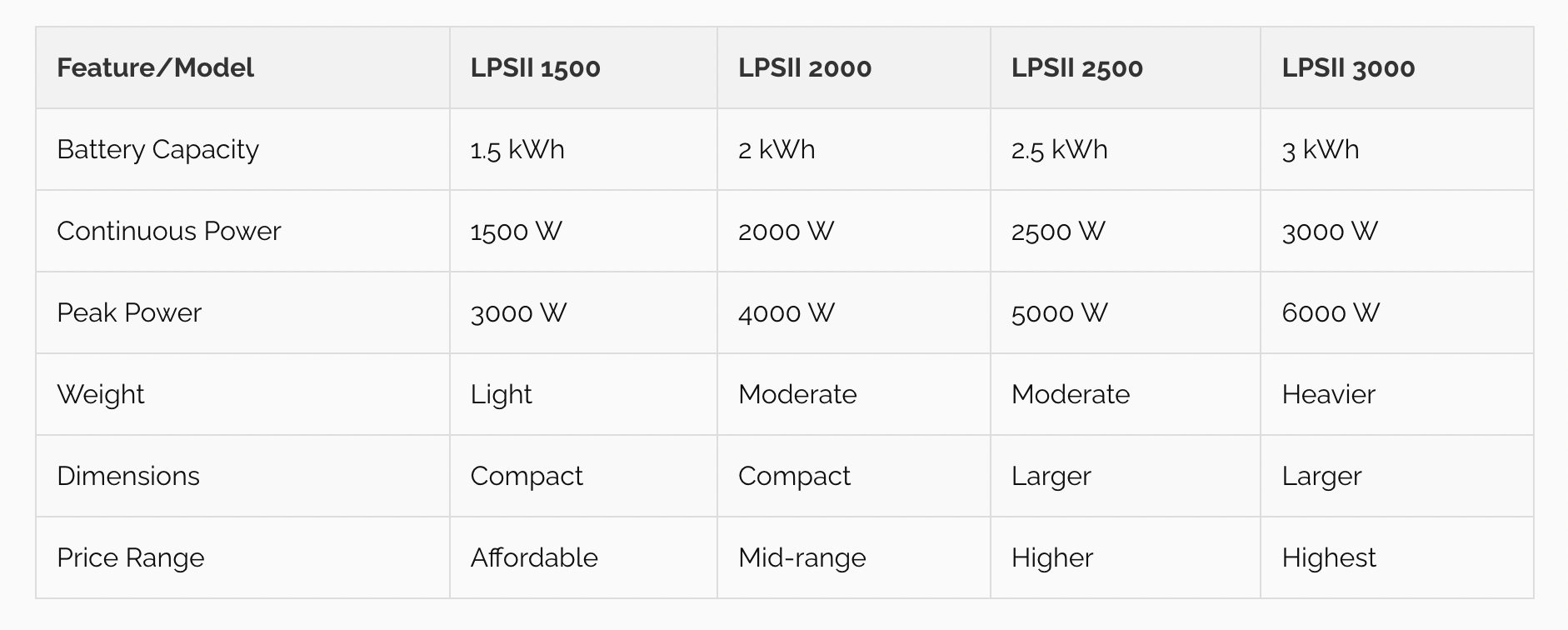 - LPSII 3000: 3 kWh, best for high power demands and running multiple high-wattage appliances simultaneously.