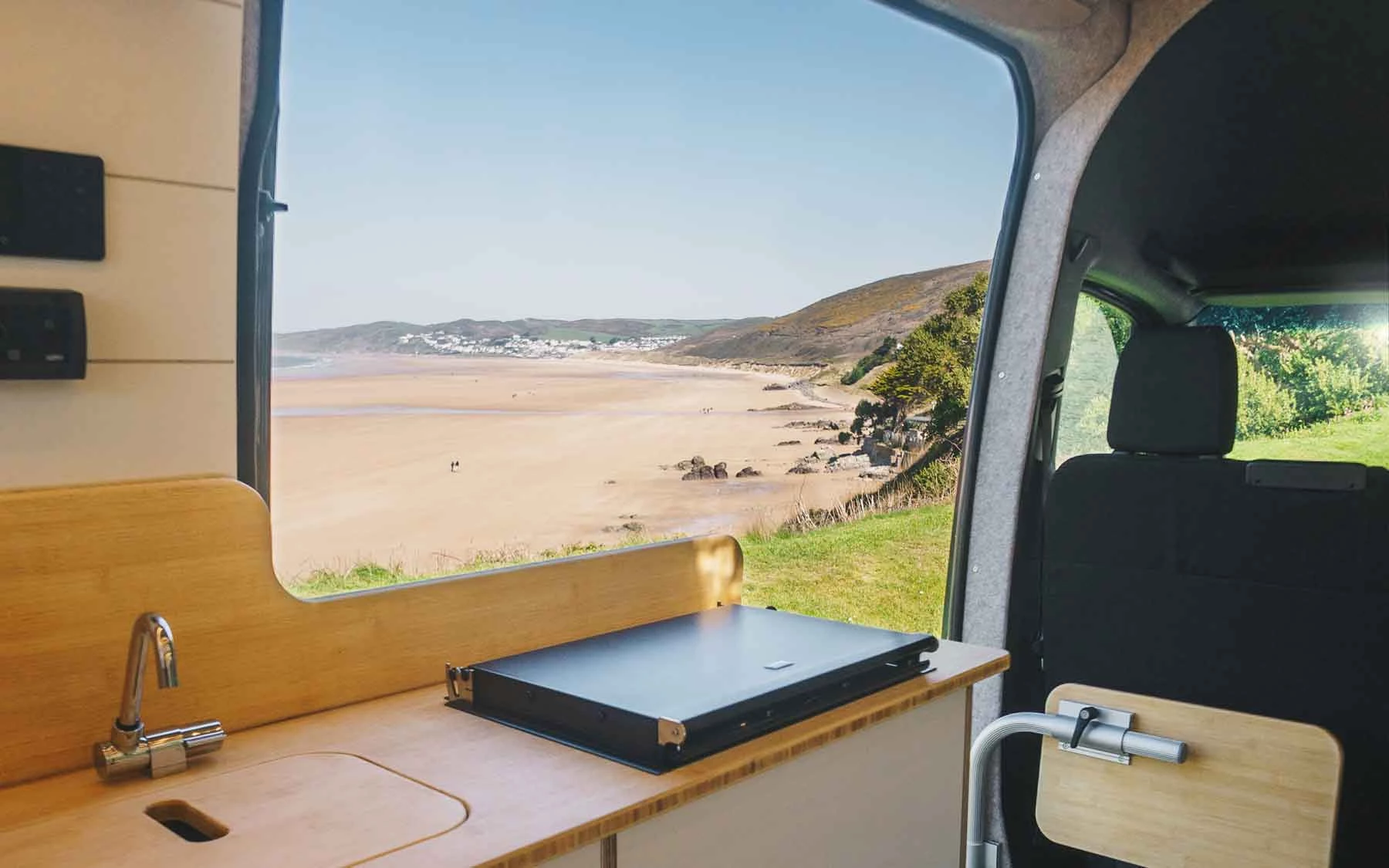 Stay cool on those warm summer days with the Off_IndelB air-conditioning unit mounted on the roof. The 86 sliding RIB bed from Banwy easily transforms the van into a 4-berth sleeping space, with a pop-top option is also available.